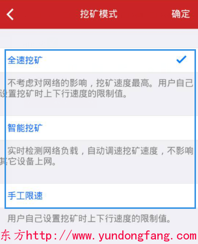 全速挖矿:不考虑对网络的影响,挖矿速度最高。用户设置挖矿时上下行速度的限制值。
