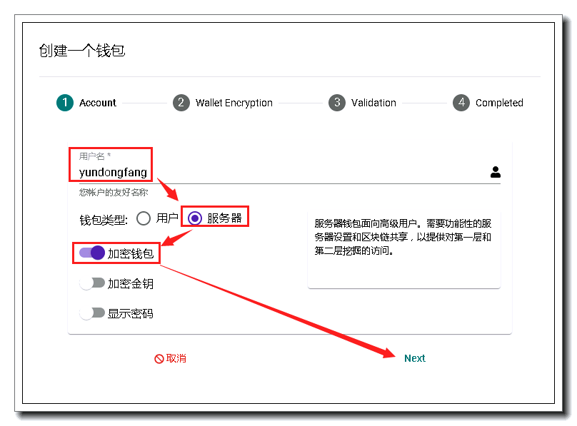 设置一个用户名,选择钱包类型:服务器,最好给钱包加个密码再下一步