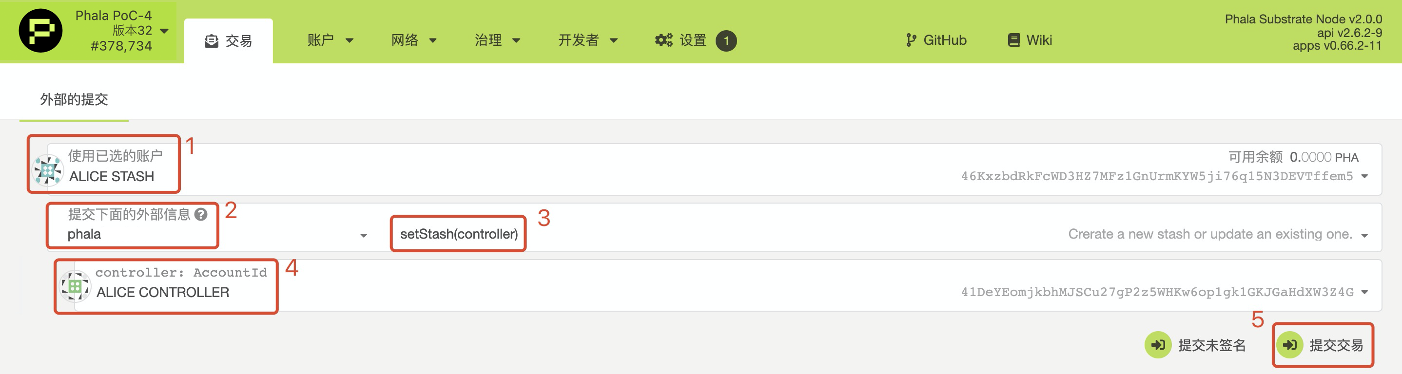 Developer(开发者) → Extrinsics(交易) → 你的 stash 账号 → phala → SetStash(controller)