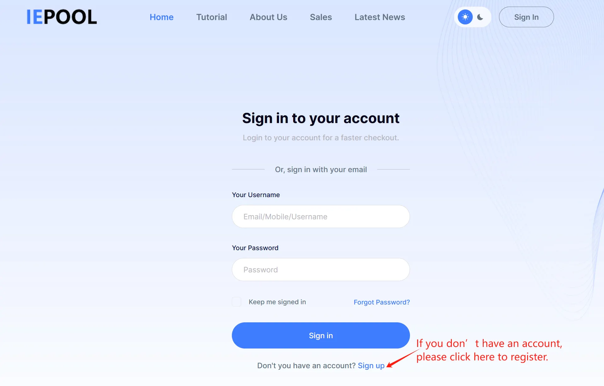 - 转到 https://www.iepool.com,然后单击右上角的“注册”按钮 角落注册。
